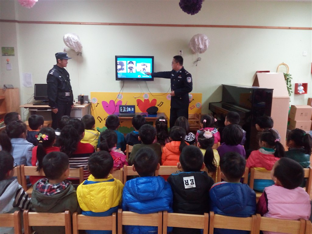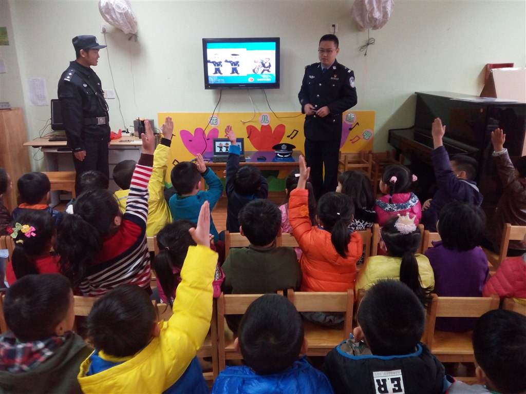 课堂上,“警察爸爸”针对幼儿的认知特点,循循善诱,形象生动的向孩子们讲解了警察的类型:有交警、特警、巡警以及消防警察,让孩子们更加具体的了解了不同警察的特点及工作职责。接着穿着民警制服的爸爸,拿着一系列的防范用具,有趣地向孩子们介绍警察叔叔每天佩带在身上器械的用途,有可以看清远方的强光手电、有用来抓捕坏人的手铐、有辣椒水来制服反抗的犯罪分子的……最后警察爸爸针对中班幼儿的年龄特点,利用PPT,图文并茂的方式介绍了不少必备的安全提示,比如陌生人来敲门小朋友不能随便开门,要请爸爸妈妈等大人来开门;外出时要跟紧大人,不能随意跟陌生人走,也不能随意接受陌生人给的糖果等。警察爸爸根据安全行路的方法,讲解了各种交通信号标志的含义,列举了各类违反交通规则的现象,进一步以生动形象的画面与语言对小朋友进行安全提醒。活动中,小朋友们听得可认真了,他们张大着一双双眼睛,把警察爸爸的提醒牢牢记在了心里。