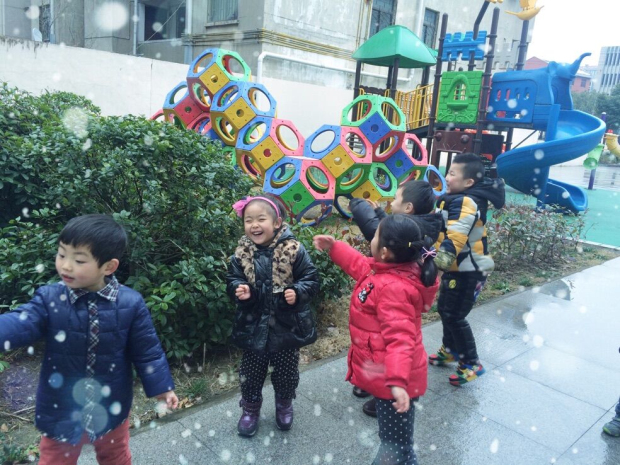 孩子们毫不吝啬自己对于雪的热情,这不,当老师问问孩子们想不想去外面看雪?他们个个兴高采烈,恨不得举起自己的双脚表示赞成。在老师的帮助下孩子们整理好衣服来到了外面,虽然常州的雪没有其他地方来的那么大那么厚,但是在孩子们眼中却显得非常珍贵,这也许和南方的气候有关,光是小小的雪花就已经足够牵动孩子欣赏美的兴致了。平时我们都用图片用视频让孩子们欣赏下雪的美景,这一次我们的孩子可以用自己的眼睛、鼻子、双手去真实的感受,孩子们对外面的小雪花儿很着迷,时常偷偷地用手去接接,用鼻子去闻闻,甚至有的孩子还会偷偷的用嘴巴尝尝。希望今年的雪花儿不要辜负孩子的期待,让我们的孩子们可以在一片银装素裹下感受瑞雪兆丰年的美,感受堆雪人打雪仗的乐趣。