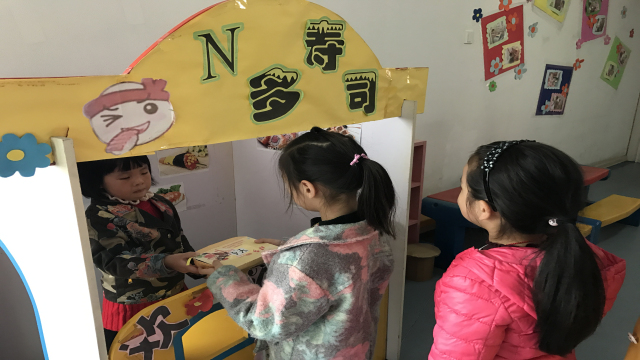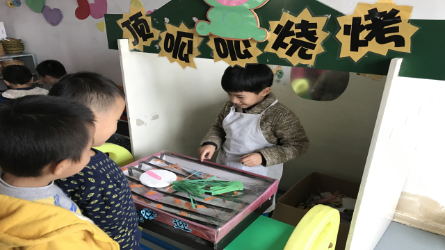 美食街里经营的“馄饨、饺子、荷包蛋、面条、小笼包、寿司、烧烤”等食品都是老师和孩子们一起利用废旧物品制作的。看,顾客们跑银行、吃烧烤、逛街玩的不亦乐乎呢!“香香的寿司,快来买咯!”,“大家看,这里有好吃的烧烤呢!”美食一条街里热闹非凡,整个游戏在轻松、愉悦的氛围中进行,每个孩子们的脸上都洋溢着快乐、满足的笑容。