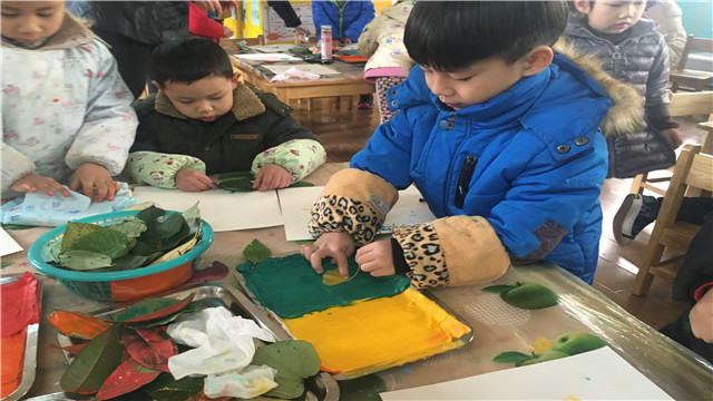 美丽的秋天来了,树叶飘落、花瓣凋零,或许给人们的清扫工作带来不便,但在孩子们的眼里,却是大自然赐予他们的天然玩具,小班的孩子正在专心致志摆弄着手中的树叶,这些金黄淡绿、形状各异的枯枝落叶在他们手中摇身一变,变成了一幅幅精美的树叶画,威武的公鸡、凶猛的狮子、快乐的毛毛虫……一幅幅漂亮的树叶贴画营造了秋意浓浓的氛围。