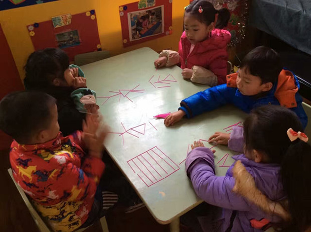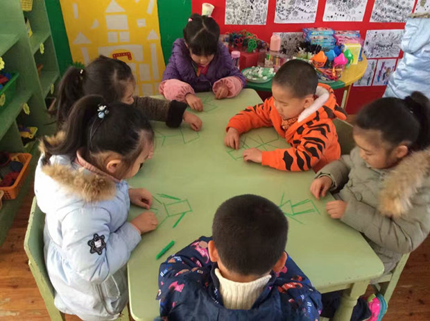 当孩子们拿到彩色的塑料棒,他们首先想到的是“点小棒”、“分小棒”等游戏。当老师提出,要利用小棒拼接的方式进行创意拼图活动时,孩子们感到很神奇,尝试着玩起了这个新的游戏。一会儿,孩子们的拼图在他们的手中出现了,有“房子”、有“小人”、还有“跷跷板”等等。孩子们的想象力是那么的丰富有趣,展现出来的成果也是琳琅满目。