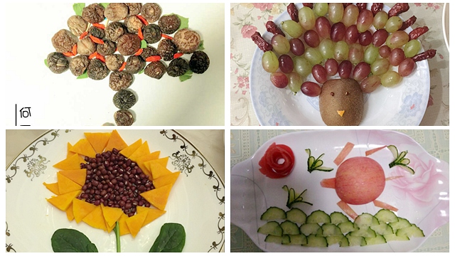 生活中常见的各种水果、蔬菜及干果等,在家长与孩子巧妙利用和创作下,一个个原本普普通通的果实和蔬菜经过雕刻、拼盘、粘贴、组合变成了各式各样创意新颖、美轮美奂的工艺品:香菇枸杞制作了“生命之树”、南瓜切片与红豆组合的“向日葵”、苹果、黄瓜做成的“海龟冲浪”、猕猴桃和葡萄、红枣做成了夸张的“妈妈的卷发”。这些作品形态各异、生动逼真,创意令人赞叹。