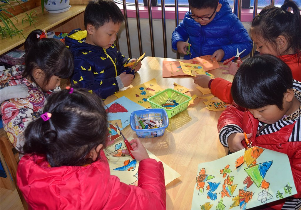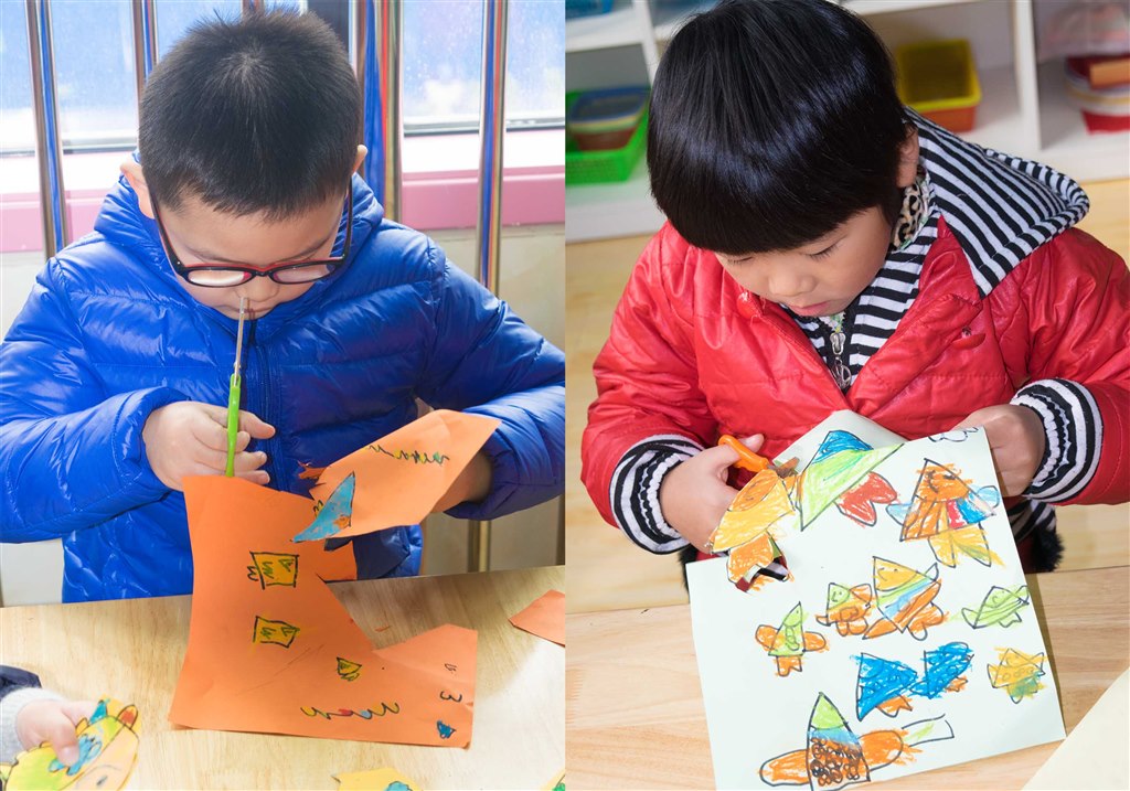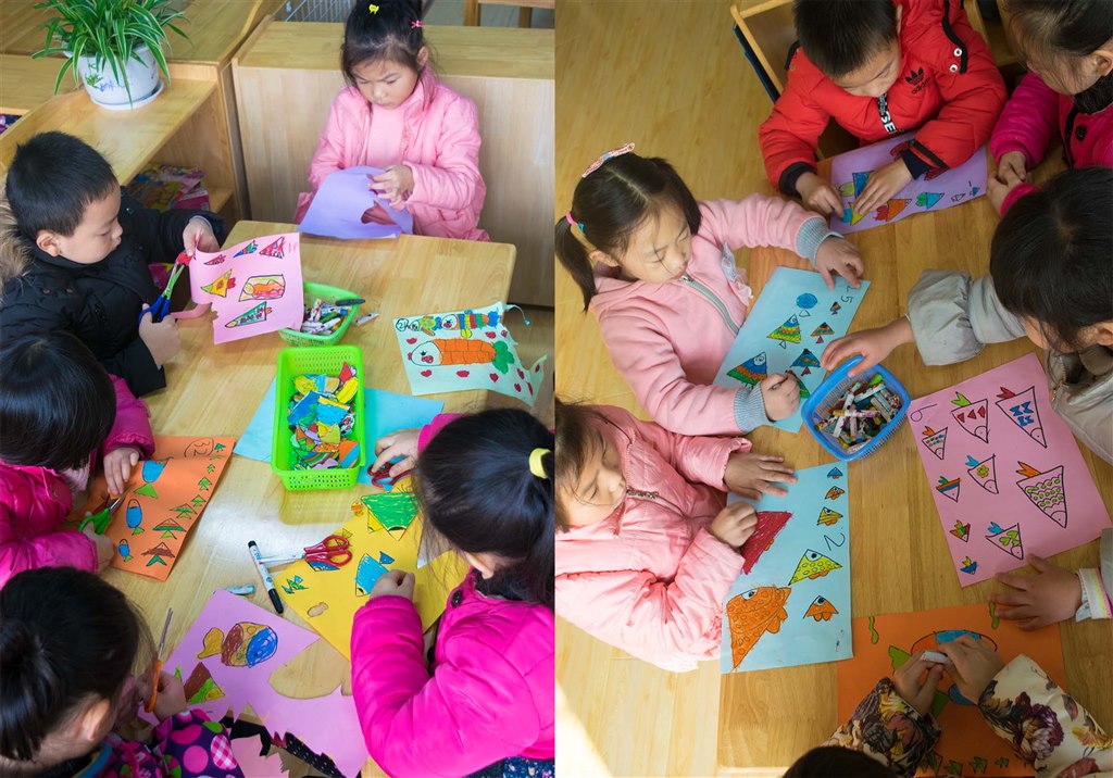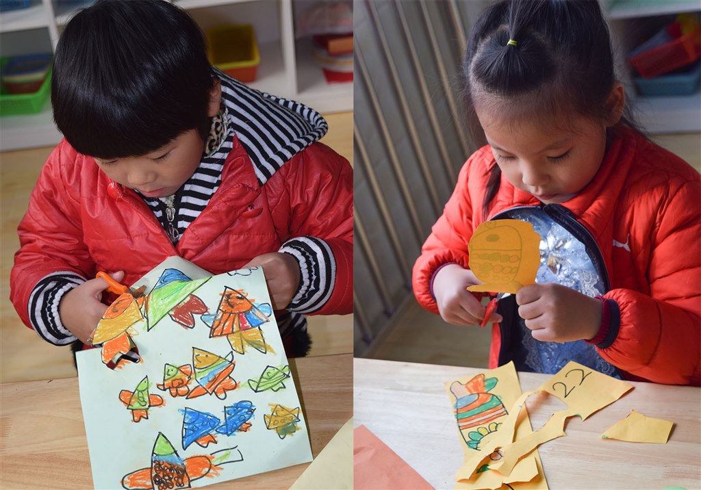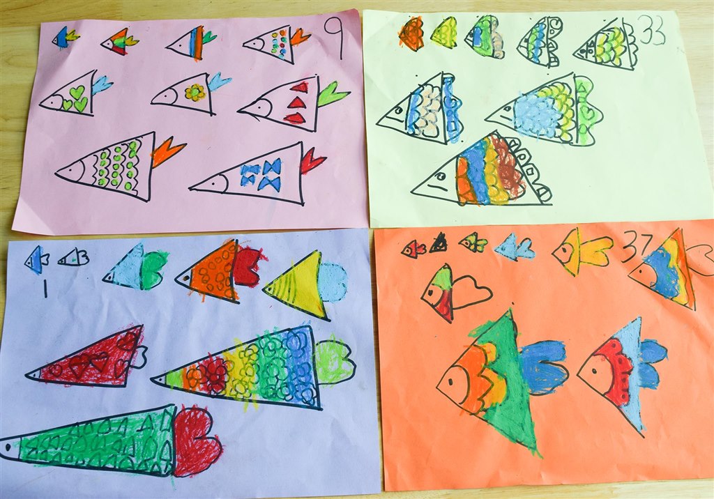 活动中,孩子们讲述了自己小班到大班的种种变化,有的会说:“我长高啦。”有的会说:“我长胖了。”也有的孩子会说:“我会的本领多了,也懂事啦!”而在这个美术活动中,孩子们化成了小鱼,作品上记录着小鱼变成大鱼的成长历程。孩子们把鱼的形态从小到大画在彩纸上,再用剪刀把小鱼们剪下来,贴在事先画好的池塘里,就这样,纸上描绘出了一幅幅生动、有趣的图画。