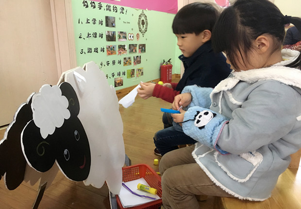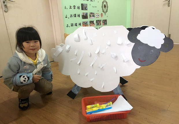 活动中孩子们在老师的引导下,尽情发挥和想象,帮助小绵羊穿上毛衣。小朋友们先把白纸撕成条状,再用粗细不一的吸管将纸卷起来,使其成卷曲壮,最后用胶棒粘贴在小羊身上,卷曲的白色纸条的恰到好处的表现出绵羊本身的特征,把绵羊的特点表现的淋漓尽致。教师的示范与讲解,帮助幼儿更加清晰地学习、掌握操作步骤与方法。