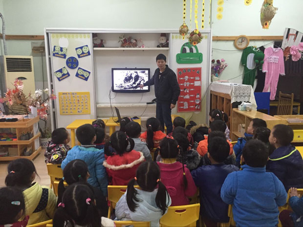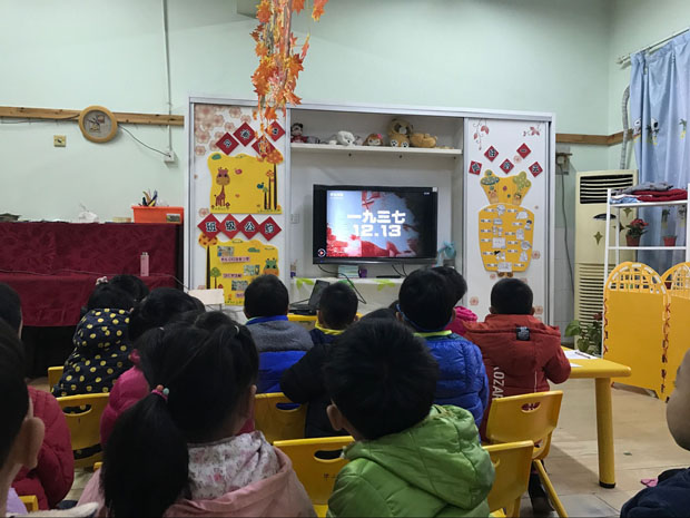 在活动中,老师声情并茂地讲述那段让人潸然泪下的历史,利用多媒体让幼儿观看了关于大屠杀的图片,那一幅幅令人惨不忍睹的画面,让幼小的孩子们屏住了呼吸,瞪大了愤怒的眼睛……老师还引导小朋友讲述自己对南京大屠杀事件的了解和认识;组织幼儿观看纪录片和爱国主义影片《王二小》,齐唱爱国歌曲《义勇军进行曲》对幼儿进行爱国主义教育,让幼儿知道今天的幸福生活来之不易。