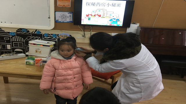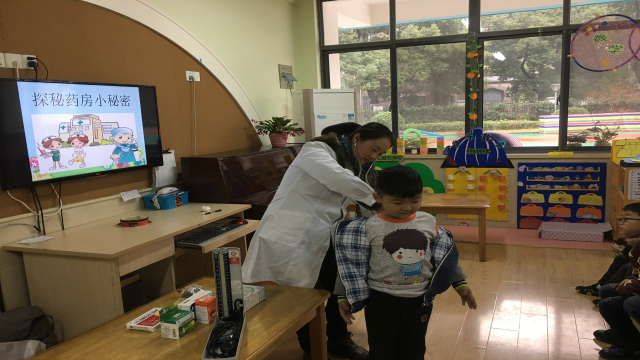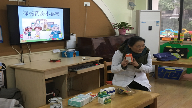 为了本次活动,医师妈妈提早做了精心的准备,针对幼儿的特点制作了图文并茂的课件。活动中孩子们对医师妈妈的到来表示热烈的欢迎,并主动向其介绍自己!此次活动共分为三部分:医师妈妈与幼儿认识常用药、幼儿体验简单的医疗器械的用法和功能、医师妈妈指导幼儿正确用药和如何预防疾病。现场气氛热烈,小朋友学得兴趣盎然。