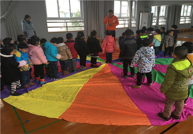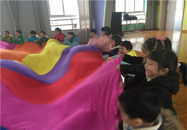游戏是孩子们的天性,“彩虹伞,转转转”不仅给孩子们带来了游戏上的乐趣,更促进了他们身体协调的发展,也促进了孩子们社会性的良好发展。