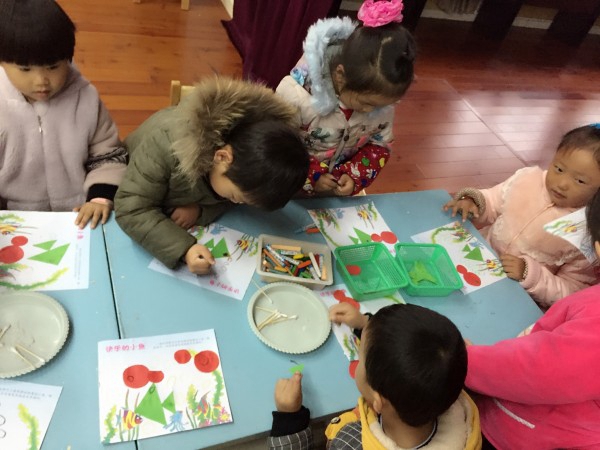 灵巧的小手动起来!看看我们的小朋友多聪明呀,他们将大小不一的三角形和圆形拼出了快乐的小鱼,小鱼们还在愉悦的吐泡泡呢!