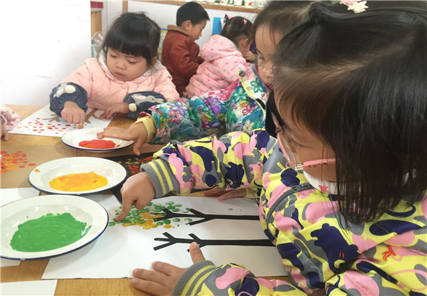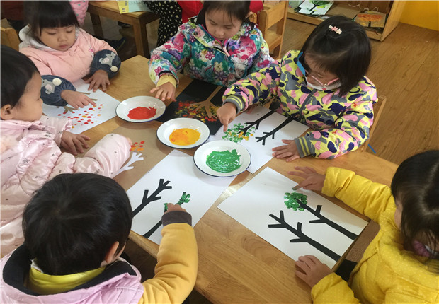 手指点画是一种特殊的绘画形式,它直接用手指蘸水粉颜料作画,利用孩子本身的素材来作画,图案出来的快,很受孩子们的喜爱。活动中,孩子们年龄虽小,但气势不小,他们用灵活的手指创造出一幅幅充满童趣的画。这些作品,显示出小班小朋友们丰富的想像力、创造力和无拘无束的表现力,为我们营造了一个个纯洁无瑕的童真世界。孩子们在涂色、玩色中感受到了色彩的美,灵活的手指一提一按都是“大师之作”。孩子们根据自己的想象快乐地创造着,树上的树叶、地上的树叶,以及色彩的搭配,都在指尖上美美的展现出来。