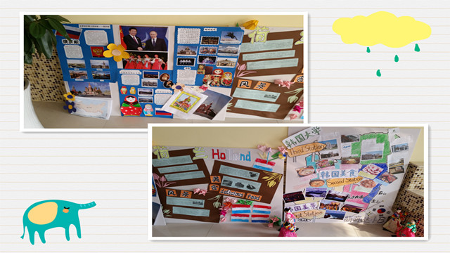 在活动中,小朋友们不仅对本班级的国家——荷兰有所了解,也和爸爸妈妈共同制作了美丽的郁金香,展示在班级的展板中。同时,老师也带领小朋友们参观了其他国家的展板,看到了法国的美丽风景,看到了韩国的特色美食,还到了俄罗斯可爱的套娃宝宝……真是丰富多彩啊!宝宝们就像开启了一趟奇妙绚丽的异国旅之,身临其境,回味无穷。这次,宝宝的爸爸妈妈们也参与了进来,和小朋友们一起利用课余时间搜集各个国家的风景、饮食、建筑等图片,让我们不仅在课上,在课间也都可以分享这些有趣的知识。