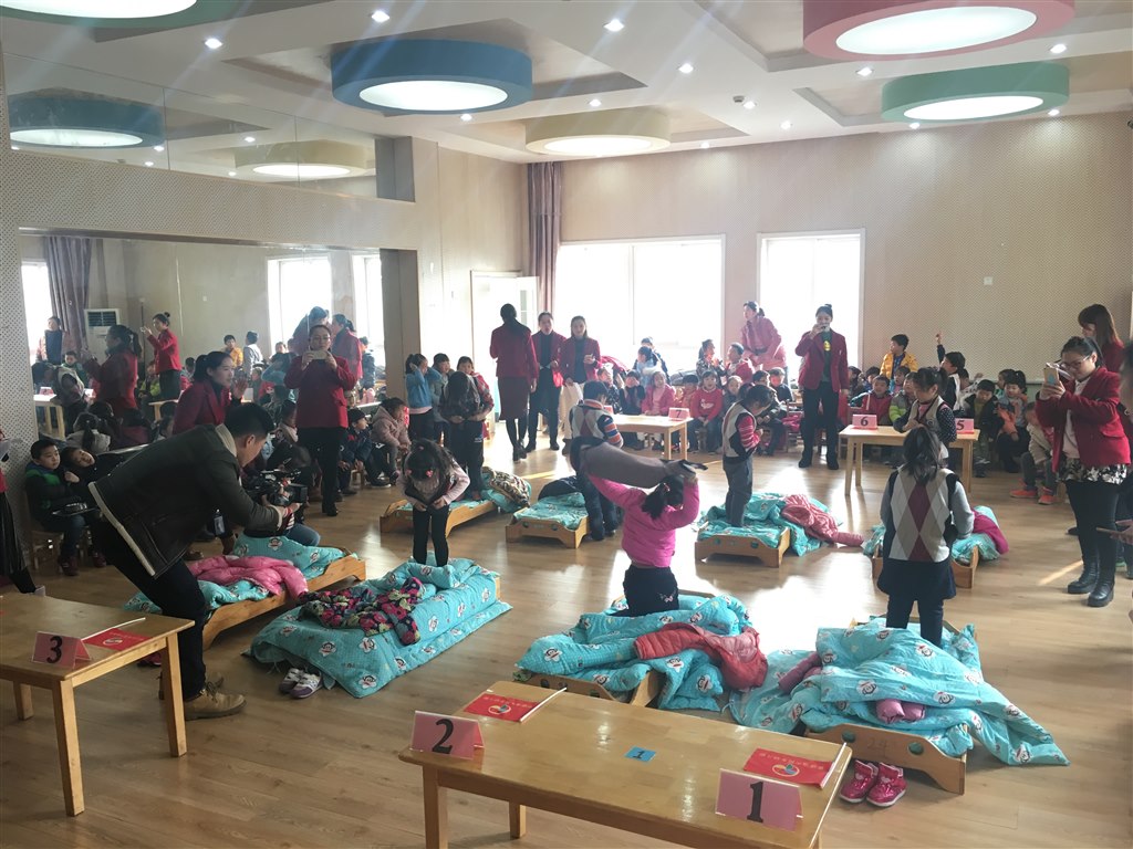 比赛过程中,孩子们随着“裁判”老师一声令下,孩子们都在努力用自己最快的速度完成比赛任务。有的小朋友身手敏捷,动作灵活迅速;有的则急于求胜,反而忙中出错,衣服的扣子扣不上;有的动作虽稚拙但很认真,坐在一旁观战的小朋友们也在为他们助威喊着“加油、加油”!比赛进行得紧张激烈,经过2个多小时激烈的角逐,评委现场评出了一等奖1名、二等奖2名、三等奖3名,为孩子们颁发了奖状和奖品。看到孩子们脸上的笑容,老师们也很欣慰!此次活动更是吸引了常州电视台“七彩00后”栏目组来园进行新闻资讯专题拍摄!