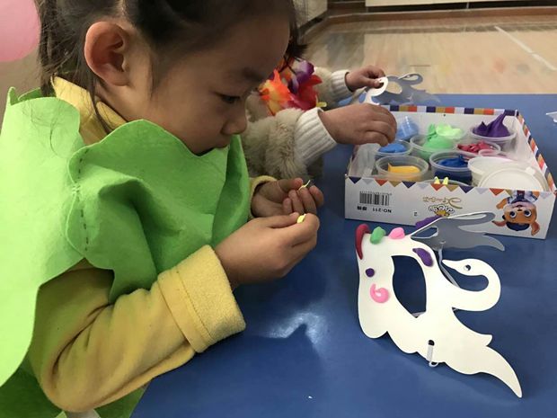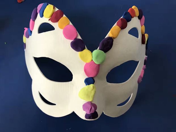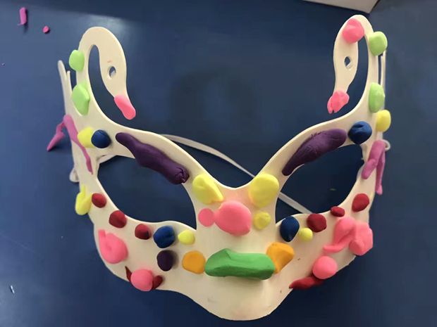 在活动中,孩子们还自己动手用各种颜色的彩泥来装扮自己的面具,打造具有个性化的面具,用自己的创意及灵巧的双手,完成了不同形象和不同风格的造型。