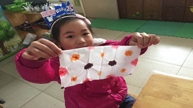 活动前,教师通过家校通的形式,说明了此次活动的目的及需要配合准备的材料。活动中,教师首先与孩子们一起欣赏优秀的印染作品,丰富孩子对印染工艺的感受,了解印染的步骤和方法;然后,出示不同形状的面纸,鼓励孩子们发挥自己的想象,尝试多种折叠的方法,孩子们有的折成三角形,有的折成正方形;最开心的还是孩子们的创作过程:他们变化着手中的面纸,沾染多种颜色,尝试着不同形状的印染效果。在印染的过程中孩子们充分发挥自己的想象力,把自己的智慧都表现在了自己的设计上,当孩子们在展开纸围巾发现美丽得出乎自己的意料时,他们高兴得手舞足蹈!