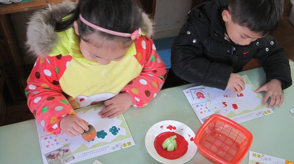 因本班部分孩子们有偏食、不爱吃蔬菜的不良习惯,所以我打算上《蔬菜印章画》这一课,通过运用我们家中最常见的一些蔬菜印画,来让孩子们从另一方面去喜欢上蔬菜、多吃蔬菜。上午,我们进行了蔬菜印章画,幼儿通过看一看,猜一猜,印一印,大胆用蔬菜截面印画,发现不同的蔬菜能印出不同的样子,小朋友玩的不亦乐乎!整个画的过程孩子们完成还是比较好的,能够掌握印章画的基本步骤,可以很好的配合老师,而且还发挥出了他们丰富多彩的想象力。