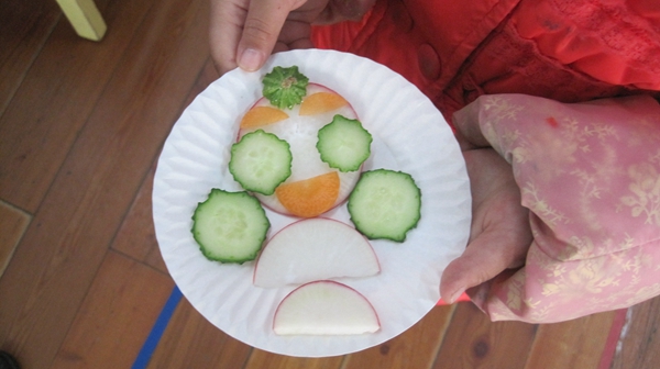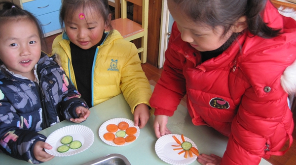 在设计《蔬菜大拼盘》活动中,我们预设到幼儿的想象力会特别丰富,在他们的小脑袋瓜中会有好多的奇思妙想,他们可能把自己喜欢的动物、植物、物品等都当左自己的朋友,因此我们把《蔬菜大拼盘》这一活动进行了有机整合。