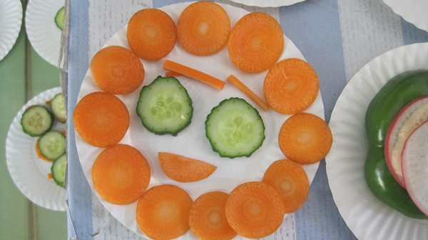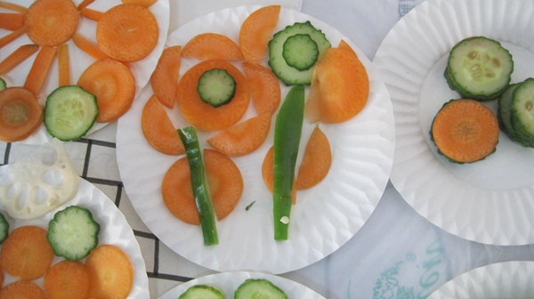 生活是艺术的源泉,在我们的生活中,美的事物无时不有,无处不在,重要的是我们如何引导幼儿去发现美、欣赏美、创造美。蔬菜是幼儿生活中常见的事物,它既有丰富的营养,又贴近幼儿的生活,孩子们都非常熟悉。蔬菜不同的形状和丰富的色彩能在激发幼儿美的灵感的基础上,萌发他们更广阔的想象空间,因此,借助中班幼儿正在形成的抽象思维和已有的审美能力,我设计了《蔬菜大拼盘》这个活动,进一步激发幼儿想吃蔬菜、爱吃蔬菜的欲望;知道多吃蔬菜对身体有好处;培养幼儿的动手操作能力、审美能力及创造力并进一步体验与同伴分享、交流合作的乐趣。于是,下午我们将剩下的蔬菜进行了蔬菜拼盘,孩子们感知认识各种蔬菜切片的形状利用,尝试用不同形状、色彩的蔬菜切片有规律地装饰美拼出了自己想象的一幅画,完成后,我们一起欣赏蔬菜大拼盘。