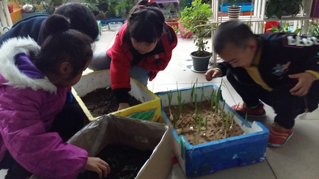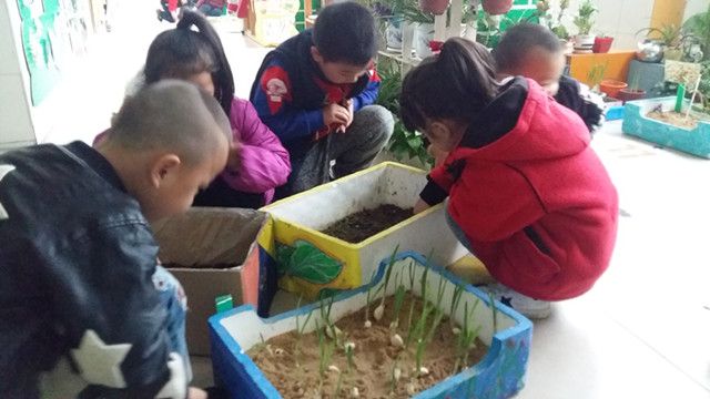 首先孩子们自由的分组,每组有5名幼儿负责照顾一种植物,他们的任务就是要保护好这些植物,不让这些植物因为冬天天气冷的原因而枯萎或死亡。孩子们个个都有责任心,看!他们一起观察这些蒜苗并一起做记录并合理分工。其中,一个小朋友测量蒜苗的高度和种植场地的温度,一个小朋友用绘画的形式记录,还有的小朋友向集体汇报他们小组的观察结果。当他们发现自己保护的植物有些枯萎的时候,他们就开动脑筋找原因,想方设法保护好它们,这种小组合作保护植物的形式,促使每个幼儿都能够奉献出自己的一份责任心。其中有的孩子发现天气越来越冷了,这些植物放在外面会被冻死,他们想出了每天放学之前把这些植物搬进教室里保温,他们细心的呵护着每一种植物。