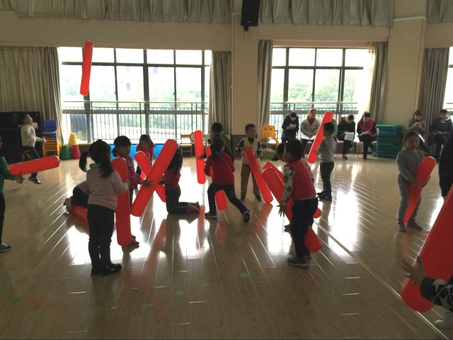 游戏中运用的道具“金箍棒”是用充气棒来替代,围绕勇渡通天河、智闯黑熊洞、快骑白龙马、齐心斗妖魔等有趣的故事情节,孩子们充分发挥充气棒的作用,设想出“金箍棒”的多种用途和玩法,有的孩子将棒投入“河”中,作为过河的垫脚石;有的孩子骑在棒上,就像骑上了威风凛凛的白龙马;还有的孩子挥舞金箍棒,打落空中的“妖怪”……在这个过程中,不但使孩子们的身体各基本动作技能得到全面锻炼,更使他们以物代物,一物多玩的想象力和创造力得到充分发挥。最后在一片打败所有妖怪的欢呼声中,孩子们感受到成功的喜悦,更进一步领会了孙悟空英勇无畏的精神本质,对这一形象也更加喜爱了。