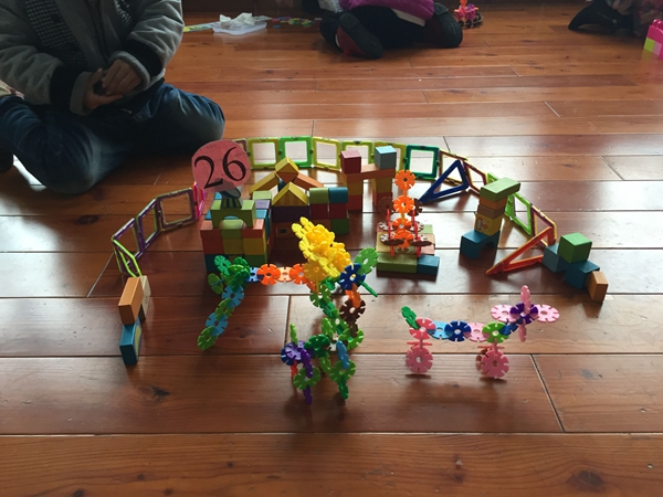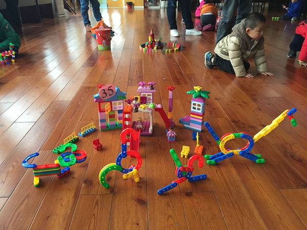 活动的最后一个议程,是孩子们期待已久的“奇趣动物园”建构大比拼!每一个家庭自带材料,在场地上进行主题建构,对于有的家庭来说,这可能是第一次认认真真蹲下身子和孩子一起合作完成一次游戏。比赛结束后,大家在自己的“动物园”上贴上号码牌,由所有家庭进行现场打分,最后由三名家长进行现场结分。