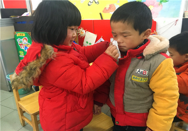 孩子们相互之间帮忙,你帮我,我帮你。平时给孩子们讲关心同伴的道理,虽然当时不一定有什么效果,但孩子真正懂得了就会付之于行动。(撰稿人:郑梦娇)