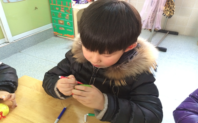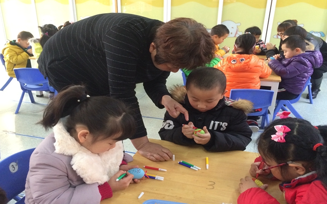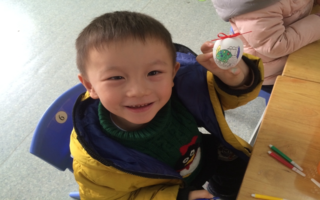 周安佑的外婆是一名退休幼儿园老师,拥有多年的教学经验,从选材到准备材料,再到课程的实施, “家长老师”认真做了很多的准备。活动中,通过“家长老师”的不断引导,孩子们大胆想象,在鸡蛋上进行装饰。孩子们平时画画都是在平面上,第一次给这样的物体涂色、装饰,孩子们兴趣越高涨,装饰出的鸡蛋也都非常的漂亮。最后大家一起把装饰好的彩蛋挂在了教室中,孩子们如痴如醉,回味无穷。
