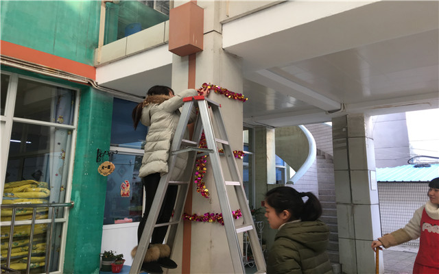 一盏盏大红的灯笼挂起来,一串串除旧的鞭炮垂下来。老师们用灯笼、鞭炮等迎新饰物装扮了这一片火红的天地。大家你一言我一语地为如何让大厅更美丽,说着自己的意见和想法。不要看她们一个个都娇弱瘦小,但做起事来却毫不含糊,当要装饰柱子时,都毫不退缩,大家争抢着爬上梯子,挂雪花,挂银丝,平时的胆小柔弱不见了,转而代之的是一个个认真无畏的身影,这也成了冬日里长一幼儿园一道亮丽的风景线。