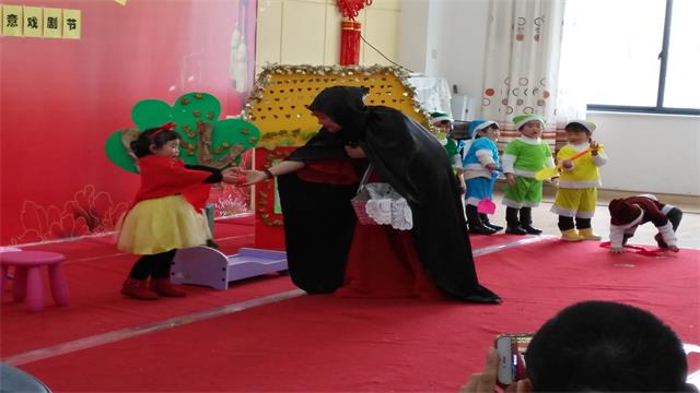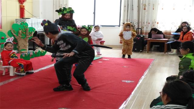 这边小一班黄梅戏新唱“大王叫我来巡山、看花灯”的音乐刚落下,那边小二班小朋友带着幼稚和天真的京剧新唱“说唱脸谱…”过来了。刚刚把掌声送给小四班家庭剧《白雪公主》的表演,这边小三班的小朋友和家长朋友也给大家带来了精彩的演出《小兔乖乖》等等。