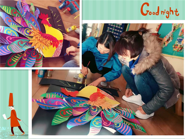 我们用巧手制作了高高挂起的红灯笼、饱含着浓浓的年味十足,温馨和暖意。班级门口是家长和孩子自制的红鞭炮,教室窗户上是老师和小朋友们剪的窗花。还有走廊的作品墙上贴满了小朋友们彩绘“福来到”!老师们一起绘制起了“雄鸡”。家园一起巧手制作,装扮教室,喜迎“鸡”年。相信来年孩子的心愿、老师的希望和家长的祈盼都能伴随着这声声啼叫得以实现。