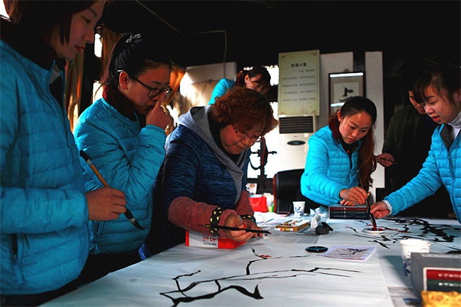 我们青年教师营的教师们用她们才艺双馨的巧手,将“九九消寒图”跃然绘于纸上!稍稍几笔,铿锵有力的枝干便以成型,老师们有的点梅,有的题字,合作的相得益彰!
