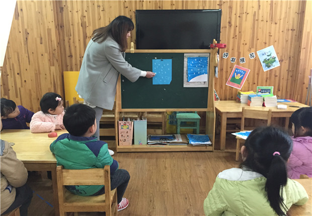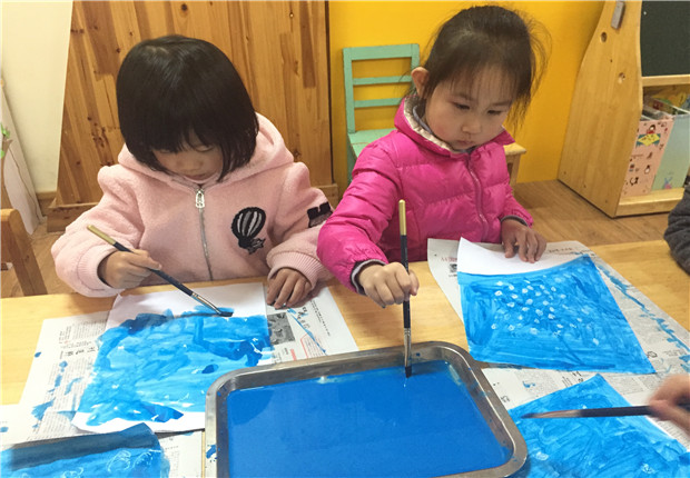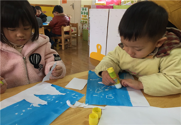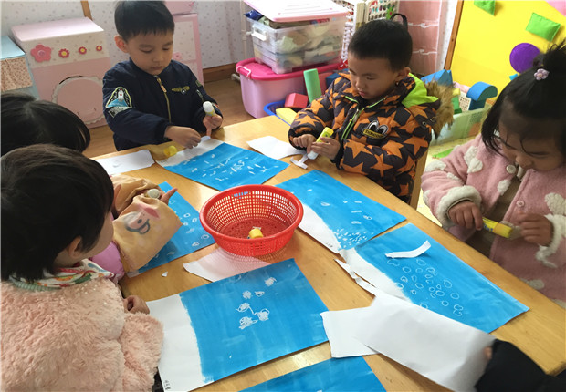 活动中,老师先示范了在白纸上用白色蜡笔画小雪花,利用油水分离的效果,再涂上蓝色水粉颜料,画面上出现了神奇的小雪花,小朋友情不自禁地喊起来:“下雪了,下雪了” 。接着,老师进行了撕纸活动,带领孩子们用白纸撕出一棵棵松树,整张画纸变得丰富而生动,从而成功地把幼儿带到了雪花纷飞的冬天,不但让幼儿感受到了冬天明显的特征——下雪,还让幼儿自然而然地掌握了涂色、撕纸、粘贴的技能,同时也提高了幼儿的小组合作能力。