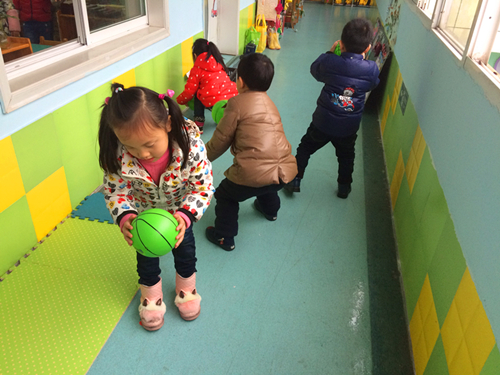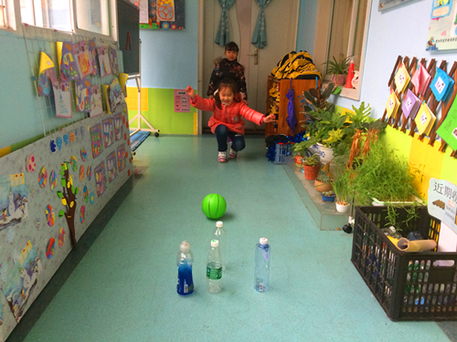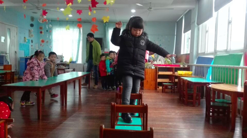 教室里可以玩什么呢?娑幼的老师开始各显神通,老师们把教室里的桌椅拼拼凑凑靠在一起,小椅子变成了小山洞、小椅子变成了独木桥、小椅子变成了障碍物、小桌子变成了高山,老师们还在走廊过道准备了皮球、保龄球充分的利用了学校的空间。各种各样的玩法让小小的教室热闹了起来,孩子们排着队伍有秩序的活动,在老师的引导下室内活动井然有序。