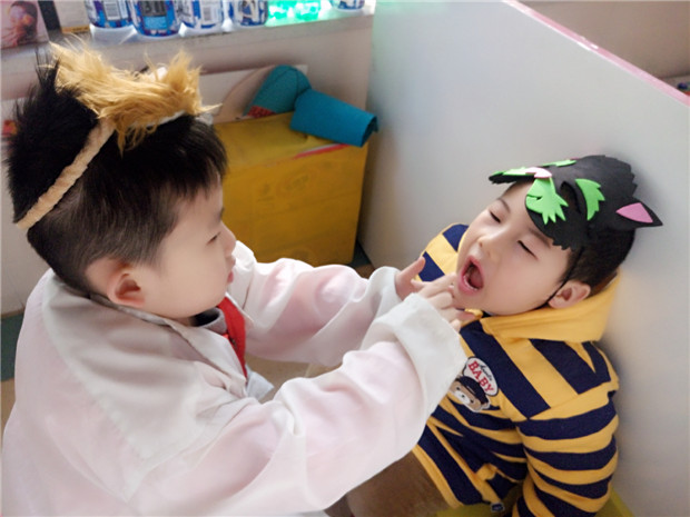模仿分为无意模仿和有意模仿。老师们有效的根据幼儿的年龄特点,在集体活动中,让幼儿适当的担任“小老师”的角色,这样使幼儿更加大胆的去表现自己。也常常给教学活动带来了意想不到的效果。结合我园“戏剧特色活动”,我们还展开了一系列的表演剧活动。让幼儿在有意模仿中学习。我们指导幼儿仔细观察角色特性,模仿角色的语言、语气以及肢体形态,甚至会组织幼儿观看各类表演剧目,以便更好的学习与模仿。