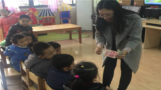 宸宸妈妈还让孩子们认识各种数值的人民币,在认识人民币数值的基础上,教会孩子们一看二模三折等方法区分真假币。为了让幼儿有更加直观的感受,宸宸妈妈还和孩子们进行了“买、卖”的互动游戏活动,并且还拿出了准备好的纸币,教会幼儿学会快速数钱的方法。同时活动中还不乏温馨的卫生安全小细节,比如让接触硬币的孩子用湿纸巾擦手、为孩子们提供有包装袋的纸币等等。最后她从钱的用途、花钱、存钱、挣钱等方面教授小朋友在生活中如何理财。