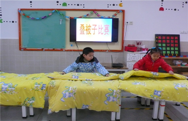 为了巩固幼儿的自我服务意识,使大班幼儿的生活自理能力和动手能力能够得到更大的进步和锻炼,体验到生活自理的乐趣,实验幼儿园大班的孩子们举行了一次别开生面的叠被子比赛。