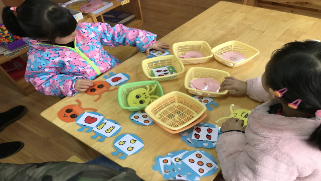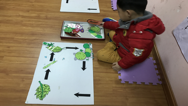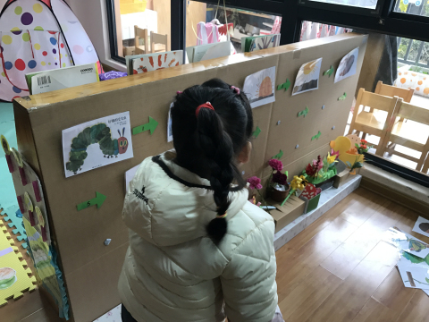 老师们围绕绘本《好饿的毛毛虫》开设了科学区、益智区、阅读区、美工区、建构区、角色区等区域。“游戏时间到了!”在老师的一声令下,孩子们纷纷选择了自己喜欢的游戏区角进行活动。游戏中,老师没有提供具体作品的图示,没有强调各游戏区的玩法,而是充分挖掘出绘本中经典的角色、对话、发展情节等元素,作为拓展绘本区域游戏的依据,设计丰富有趣的绘本区域游戏内容,并在各游戏区内提供多种材料供幼儿选择,充分体现了幼儿的自主、自由、自发行为,发挥幼儿自主探究的能力、创造能力。
