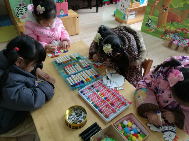 活动开始之前,教师首先向幼儿讲解了鸡的来历、传说和故事,随后在区域中开展了“巧手做金鸡”手工制作活动。孩子们先将“金鸡”的外形画好,再在“金鸡”的身体上画上喜欢的图案,最后用彩笔为“金鸡”涂上漂亮的颜色,一个五彩“金鸡”挂饰就完成了。