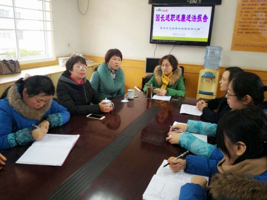 为进一步落实党风廉政建设,促进干部作风建设,2017年1月12日中午,常州市吉的堡双语幼儿园在会议室开展了2016年度党政正副职述职述廉述法总结大会,天宁区教育文体局纪委书记莫静晓、监察室倪群主任及吉幼的部分教职工参与了本次会议。