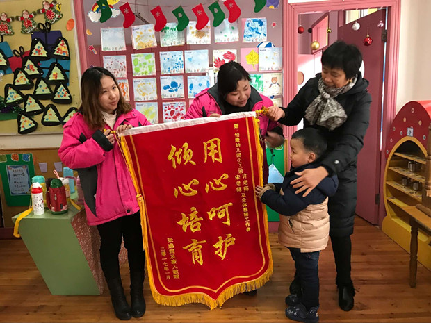 老师和家长回忆起开学初,外婆带着一个懵懂、顽皮的孩子来到幼儿园,愁容满面地对老师说,孩子的父母工作非常忙,与孩子相处的时间不是很多,孩子不怎么听话,希望老师多关注。通过一学期的相处,老师发现了家长口中的一些缺点、同时也发现孩子一些闪光点。我们知道,办法总是比问题多。多多(小名)对音乐很敏感,扬长避短,老师就陪着他唱歌,喜欢拼图,就和他一起拼。慢慢地,在老师细心、耐心、爱心的培育下,多多对集体学习产生了兴趣,能主动参与集体活动,生活习惯也有了良好的转变。孩子的点滴进步,家长们看在眼里,记在心里,正如锦旗上所说“倾心培育,用心呵护”。为感谢老师们的辛勤付出,特意在这新年伊始赠送锦旗,以表心意。