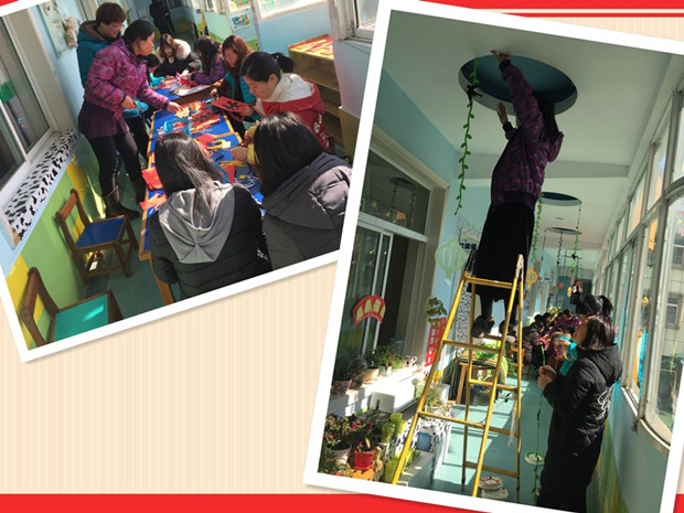 大家分工合作,有的负责整理东西、有的负责打扫卫生、有的负责剪贴,有的负责悬挂到长廊上……在和暖的阳光下,每个亮丽的身影虽忙碌着,但都有说有笑,热闹非凡。此时,感受到了集体的热情,感受到了融洽的氛围,有的老师还克服了恐高的心理障碍。通过几天的努力,我们的教室和幼儿园外环境都展现出了新的容貌,在这亮丽的风景下还承载着大家的欢声笑语,承载着大家的齐心协力,承载着老师们对孩子们的责任。
