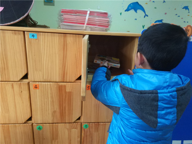 每个学期开始,孩子们都会有新的幼儿画册、泥工和油画棒,这次我们给每个小朋友准备了一些彩色小纸片,让孩子们用自己的方法写上自己的标志,然后自己贴在自己的用品上。这样通过自己的亲手制作,孩子们也体会到了自己做小主人的感觉。上个学期,常常发现幼儿的柜子乱作一团,东西经常找不到。但小朋友马上就要准备上小学了,许多事情都要自己做了,每人的柜子都要自己整理,就像要整理自己的小书包一样。应该怎样整理自己的柜子呢?幼儿进行了分组讨论,大胆说出自己的好办法:就是要把自己的柜子收拾整齐,东西要有秩序的摆放好,这样取东西就方便了,也不会影响我们做其它的事。接着幼儿开始整理自己的小柜子了,通过整理柜子,引导幼儿尝试将图书、油画棒等纸进行分类,并有序的摆放。