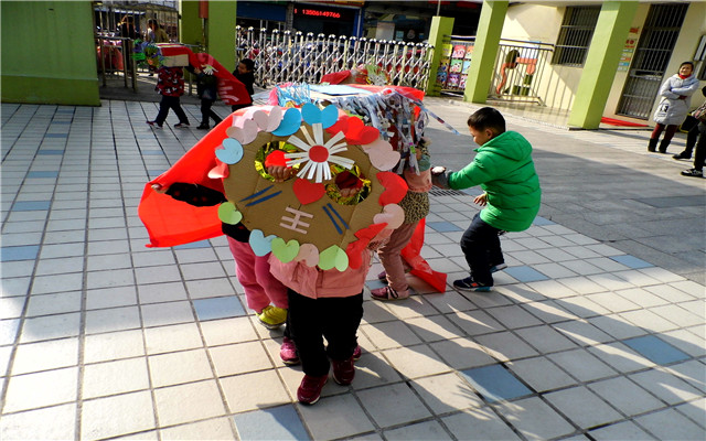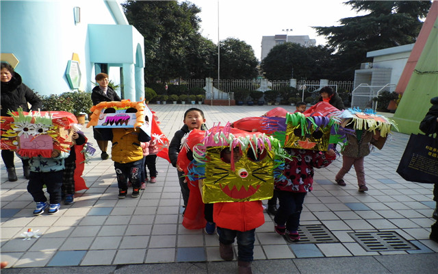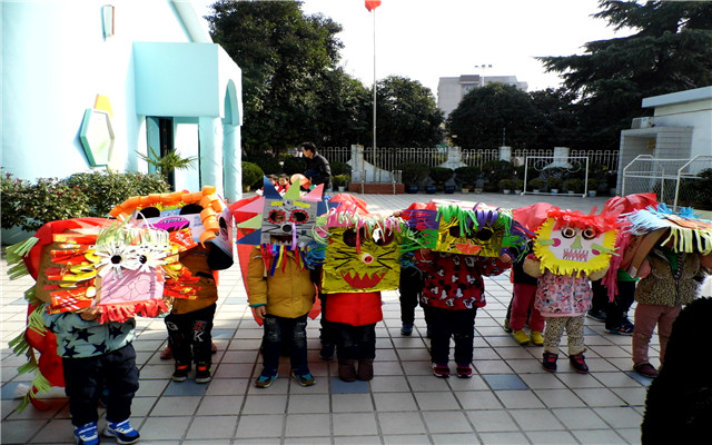 为了这次活动的顺利开展孩子们早早做了准备,和老师一起收集了多种废旧材料,如牛奶盒子、报纸、纸杯、光盘、彩带等。通过老师孩子们的精心设计,一双双巧手的打扮,一个个活灵活现,色彩绚丽的狮子便腾空出世,精彩HOLD也HOLD不住。