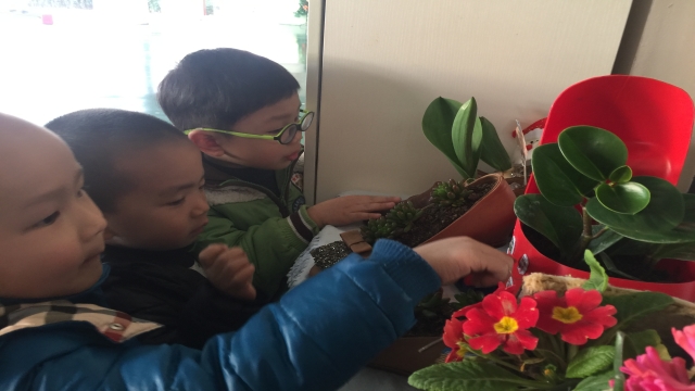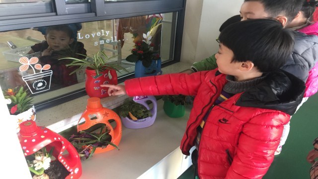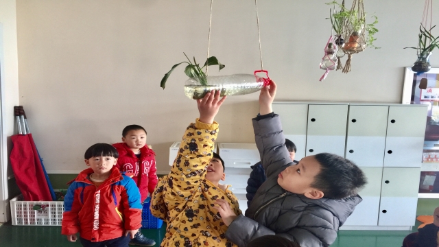 为让孩子们近距离接触自然界的各种植物,充分感受并学在其中、乐在其中,教师发动家长进行了“旧物巧利用,创意乐种植”活动。家长们发挥自己的无限创意,利用各类废旧材料进行多样种植。废旧的洗衣液瓶子在巧手妈妈的手里变成了独特的花瓶;废旧的鞋子里开出了花朵;饮料瓶大变身成了小泥鳅的“游泳池”……走廊上增添一抹新绿,多了一份生机,引得来往的师生。翠绿的颜色格外惹人喜爱。孩子们一有空就仔细的观察,一起发现探索。并开心地交流。