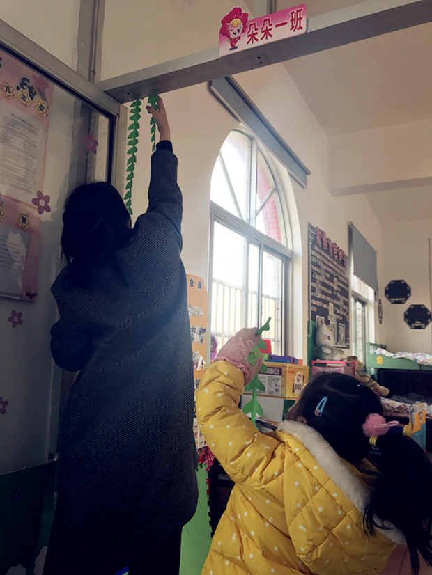 老师根据幼儿的年龄特点、教学内容和空间面积,用自己灵巧的双手制作了各种各样的装饰品,如柳叶、桃花、风铃等的。基于对幼儿教育的独特感悟,大胆构思、精心创设,用旧纸板、网格、不织布等材料,创设了富有绘本特色的氛围。孩子们和老师一起合作、一起创想,将这些环境创设融教育、艺术、和谐为一体,焕发出勃勃的生机。