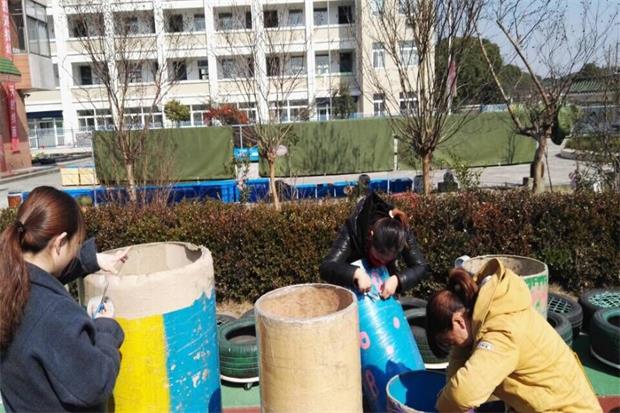 大型塑胶场,张金老师带着大班老师把滑滑梯的锈迹去除,包上透明胶;侯佳老师包梯子,蒋琴华和金瑛老师给球打气,陈秋老师带着教研组长整理修复纸管;三位阿姨对所有的小板凳逐一清理、消毒……
