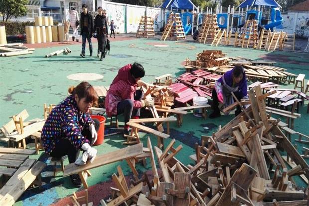 新大楼塑胶场,蒋惠娟园长带着中班老师清理木工区,将生锈的钉子剔除,将发霉的芦苇清理,将不再好用的木片去掉;外墙上脱落的管子包好了,翘起的钉子敲好了,自然角里破损的罐子修复了……
