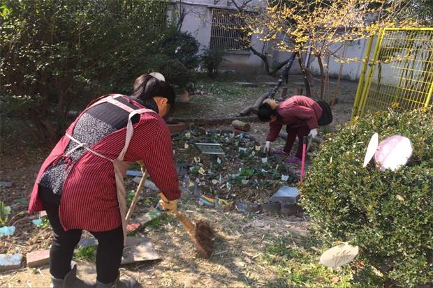 绿化园地,吴文萍副园长带着专业修树师傅在修剪黄杨、修剪黄金条;查春凤老师带着阿姨去除枯叶和杂草、整理菜地;侯秋兰副园长带着小班老师整顿竹园、修剪月季花……