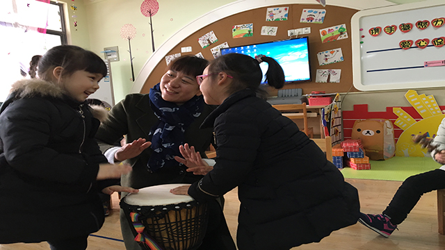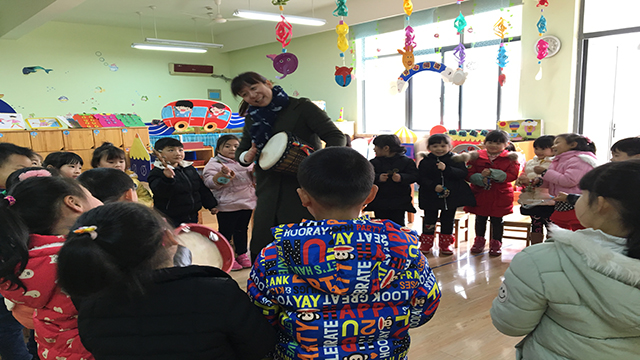 活动中孩子们自由选择乐器,商量出演奏方案。三角铁、碰铃、铃鼓、圆舞板等打击乐器发出了美妙的声响,教室内弥漫着快乐的元素。此时老师也带着神秘乐器加入进来。这是什么?孩子们顿时被这东西深深吸引住。老师告诉孩子们这是非洲鼓,鼓身上都有鲜艳的图案。随后又示范了一些打鼓的基本要素,如:鼓面上的打击位置是哪里,手要如何放置,手掌如何击打鼓面等等,简单的学习之后,孩子们来了兴致争先恐后想来体验一下,场面真的是热闹非凡。最后非洲鼓和所有乐器一起演奏了一首《小宝贝》,期间展示了幼儿扎实的打击乐演奏水平,为幼儿园带来了久久回荡不息的旋律!