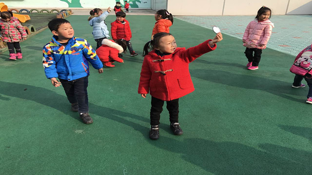 影子是幼儿几乎每天都能见到的,也是孩子们感兴趣的话题。影子时大时小、时隐时现等各种各样的变化,都引起幼儿强烈的好奇心和探究欲望。但拿着镜子在室外借助于太阳的光能来找影子还是第一次。孩子们自主分成小组玩手拿镜子玩了起来。只见他们其中一人慢慢晃动镜子,让其他小伙伴们去抓或踩“太阳”,玩得不亦乐乎。