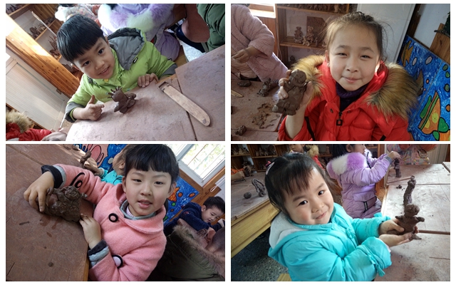 记得有位教育学家说过“怎样的环境能得到怎样的刺激,得到何种印象”,新学期开始啦,孩子们第一次来到了能激发幼儿泥塑兴趣,丰富孩子创作灵感的“陶吧”,结合主题“我长大了”孩子们通过交流“我长大了可以干什么?”“长大了我的外形特征有什么改变”确定了陶泥创作内容;通过模仿观摩“看书”“打球”“跳舞”等动态激发了创作灵感;通过欣赏陶吧里面陈列的老师、小朋友、爸爸妈妈们的各式泥塑作品丰富了幼儿操作经验,在宽松、愉快又具有情境性的氛围中,孩子们体验到了自由、尊重、信任、友爱,他们自信大胆的去想象、创造,独立自主的塑造形象,认真、专注、独立、自信、快乐都呈现在那一张张神态各异的小脸上。