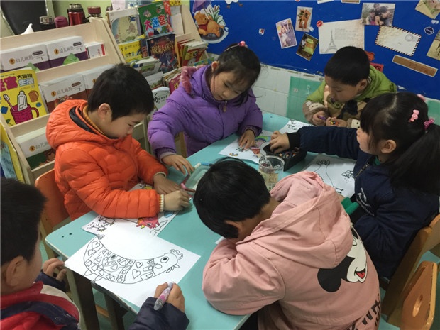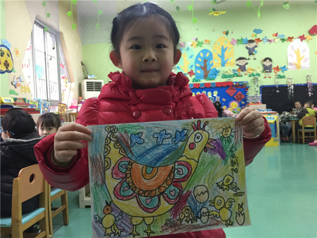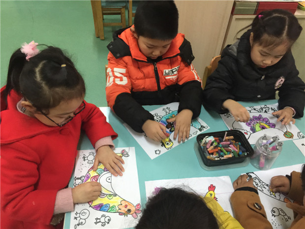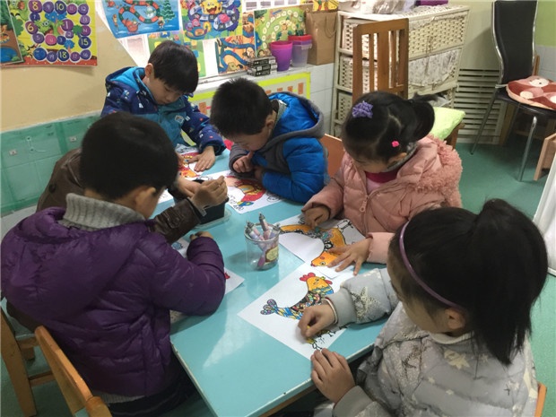 早春的寒意使得孩子们的小手都冻得红通通的,但这并不能减少他们回味新年的热情。在老师的提议下,大家决定用鸡年画鸡的方式来互送祝福。才从老师那里接受过爱的拥抱的小朋友们,拿起各自作画的工具,神采奕奕地开始自己的创作。他们有的独自创作,有的三两合作;有的画线描画,有的用蜡笔;有的以轮廓现其神韵,有的彩绘纹理精工细作……不一会儿,一只只各具风格的“小凤凰”就初具雏形。